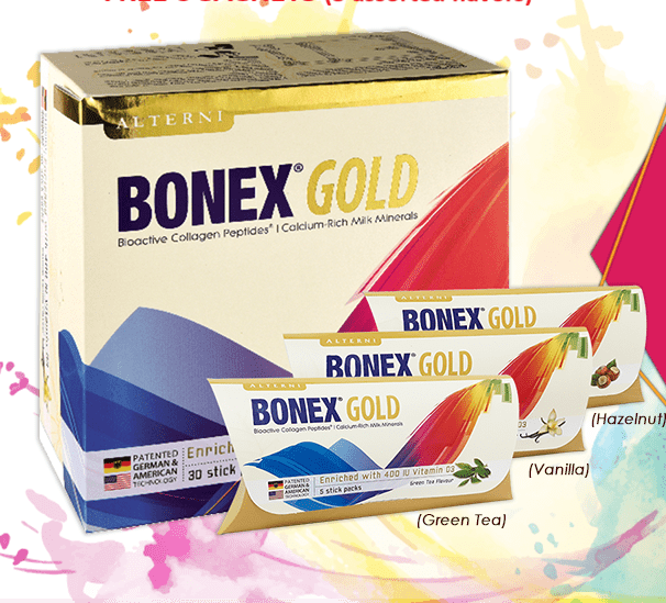 BONEX® GOLD is a nutritious drink formulated to contain premium-quality collagen. It is enriched with milk calcium and Vitamin D to support healthy bones. It contains a bold all-natural hazelnut flavor. Repacked in Malaysia using Bioactive Collagen Peptides® from Germany (Gelita AG); Calcium-Rich Milk Minerals from U.S.A. (Glanbia, Plc). This product contains milk and ingredients of bovine origin.